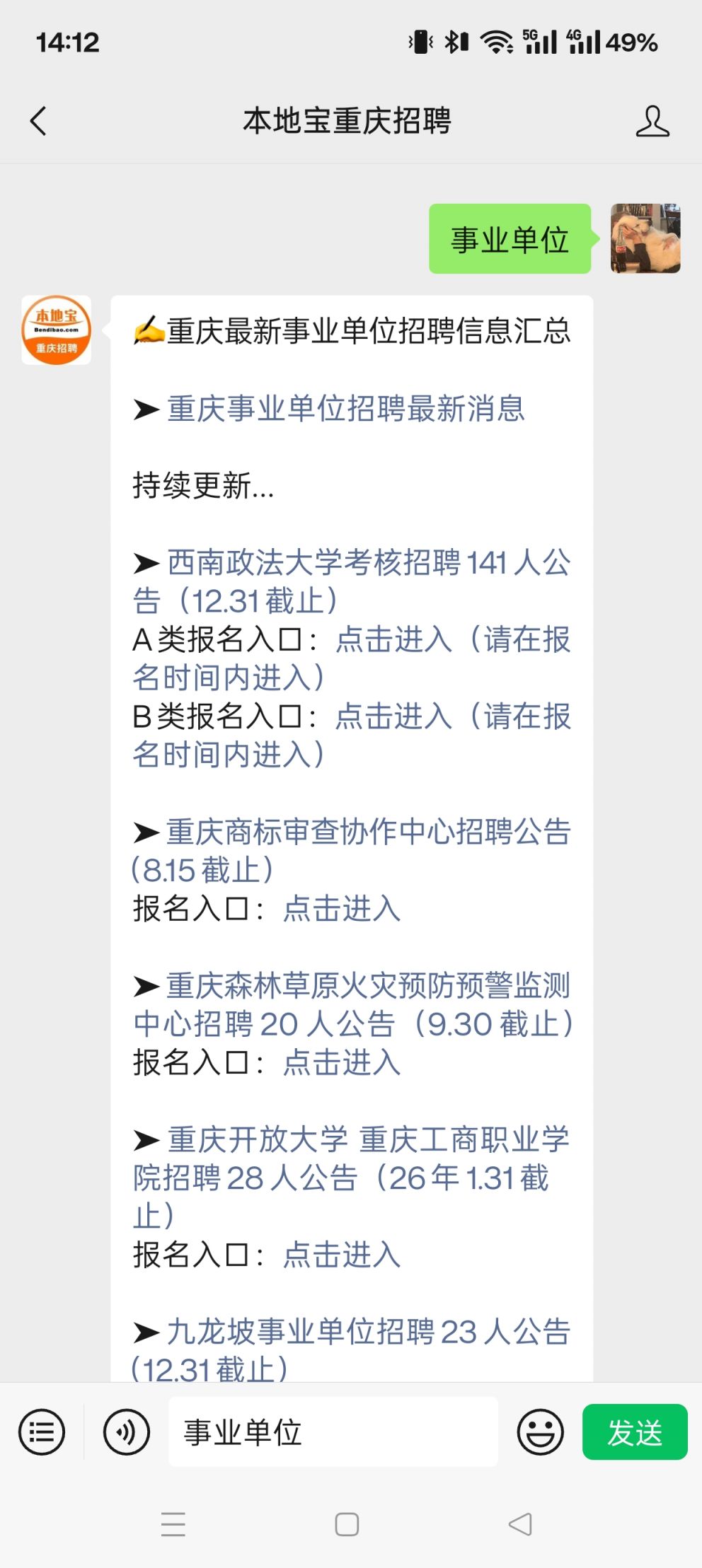 温馨提示:微信搜索并关注【本地宝重庆招聘】公众号,聊天对话框回复【事业单位】可获重庆最新事业单位招聘公告、招聘岗位、报名方式等信息。