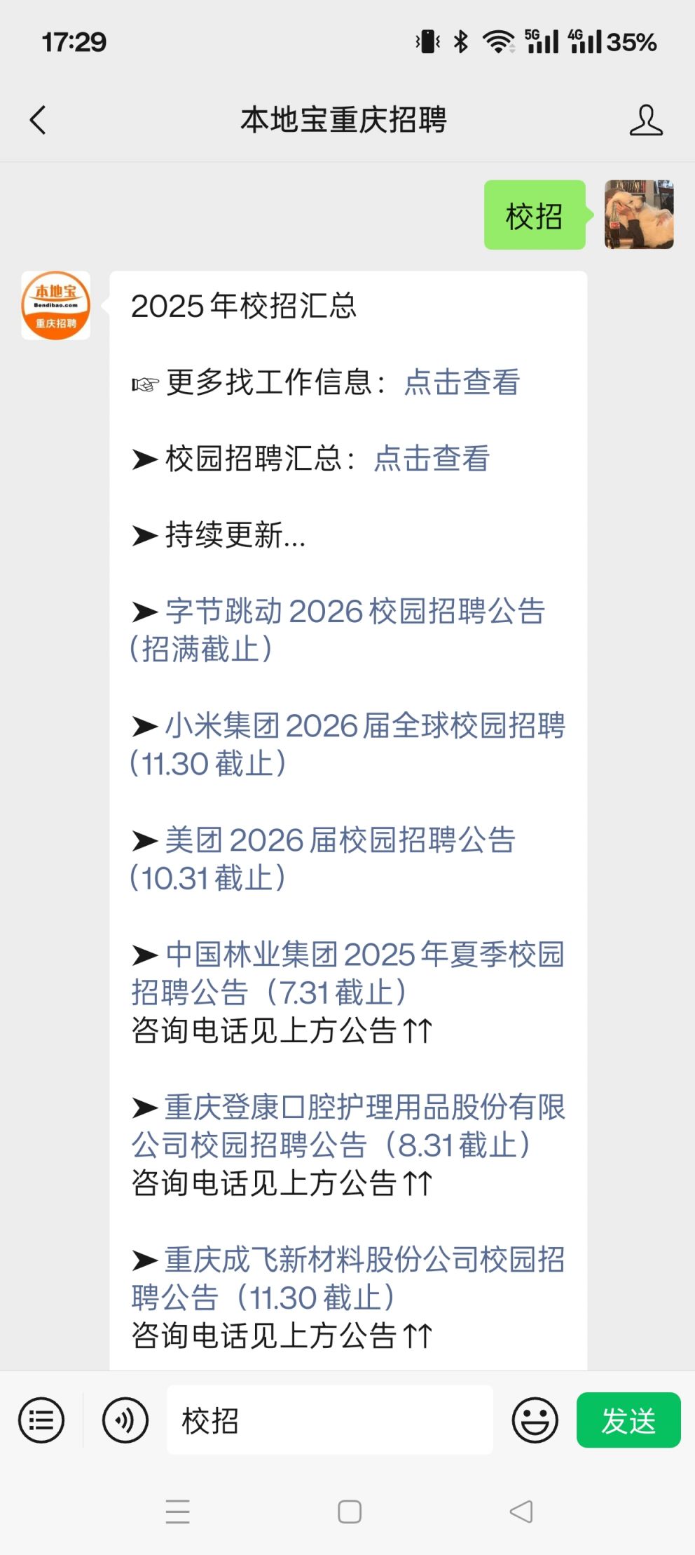 温馨提示:微信搜索并关注【本地宝重庆招聘】公众号,聊天对话框回复【校招】可获重庆最新校园招聘公告、招聘条件、招聘岗位、报名入口等相关信息。