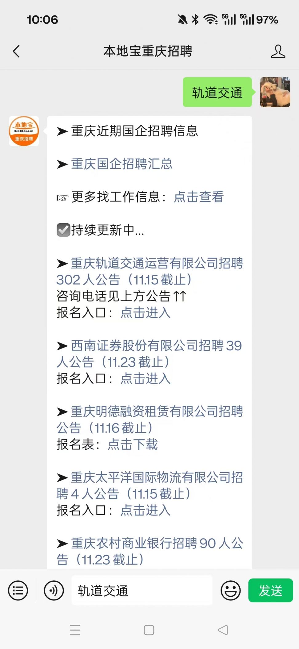 温馨提示:微信搜索并关注【本地宝重庆招聘】公众号,聊天对话框回复【轨道交通】可获重庆最新轨道交通招聘公告、招聘岗位、报名入口等相关信息。回复【国企】即可获取重庆最新国企的招聘相关信息。
