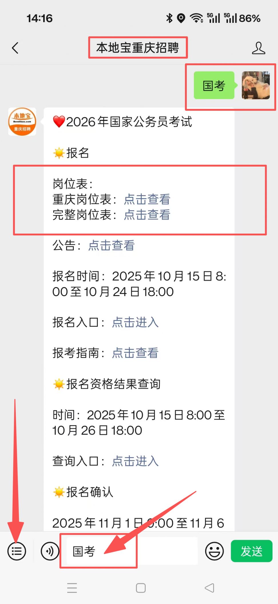 温馨提示:微信搜索并关注【本地宝重庆招聘】公众号,聊天对话框回复【国考】可获2026国家公务员考试招考公告、报名入口、岗位表、准考证打印入口等相关信息。