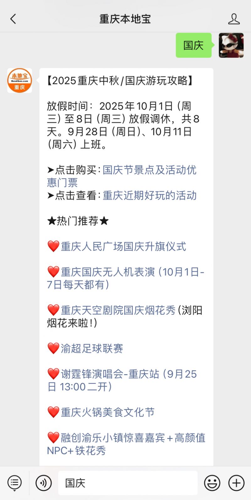 温馨提示:微信搜索公众号【重庆本地宝】,关注后发送【国庆】获取重庆国庆/中秋活动大全(1元烟花秀/免费无人机/火锅节/漫展/演唱会/渝超足球联赛等)、景点免费/优惠、免费预约景区门票及攻略,1-7日旅游攻略。